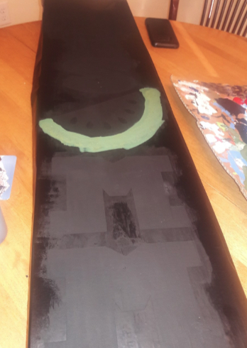 Here is the board fully painted. You can see that we started painting the watermelon rind green (don’t worry about it if you used a different color to start the rind- you won’t be able to see it).